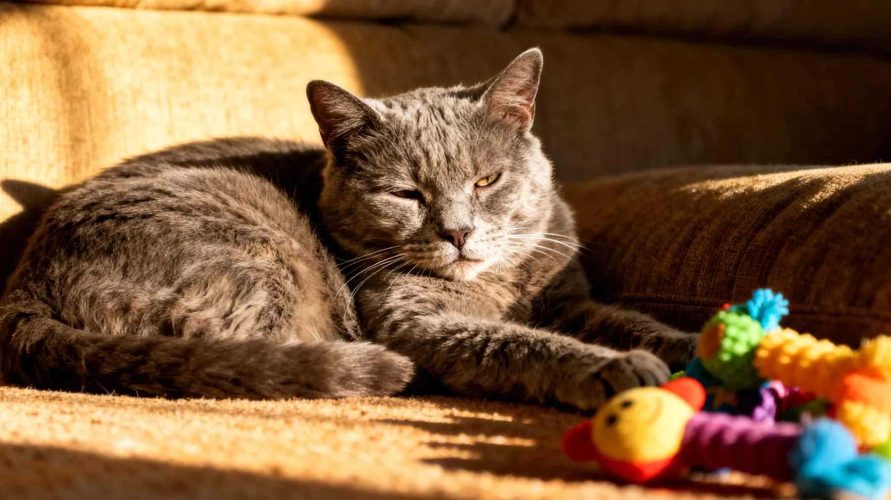 Hinzu kommen sensorische Veränderungen: Die Sehkraft lässt nach, das Gehör wird schwächer, und plötzlich wirkt die rasant über den Boden huschende Federmaus nicht mehr so aufregend wie früher. Die nachlassende kognitive Funktion – vergleichbar mit einer Demenz beim Menschen – tut ihr Übriges. Katzen mit kognitiven Einschränkungen zeigen Orientierungslosigkeit, verändertes Schlafverhalten und eben auch deutlich weniger Spieltrieb.