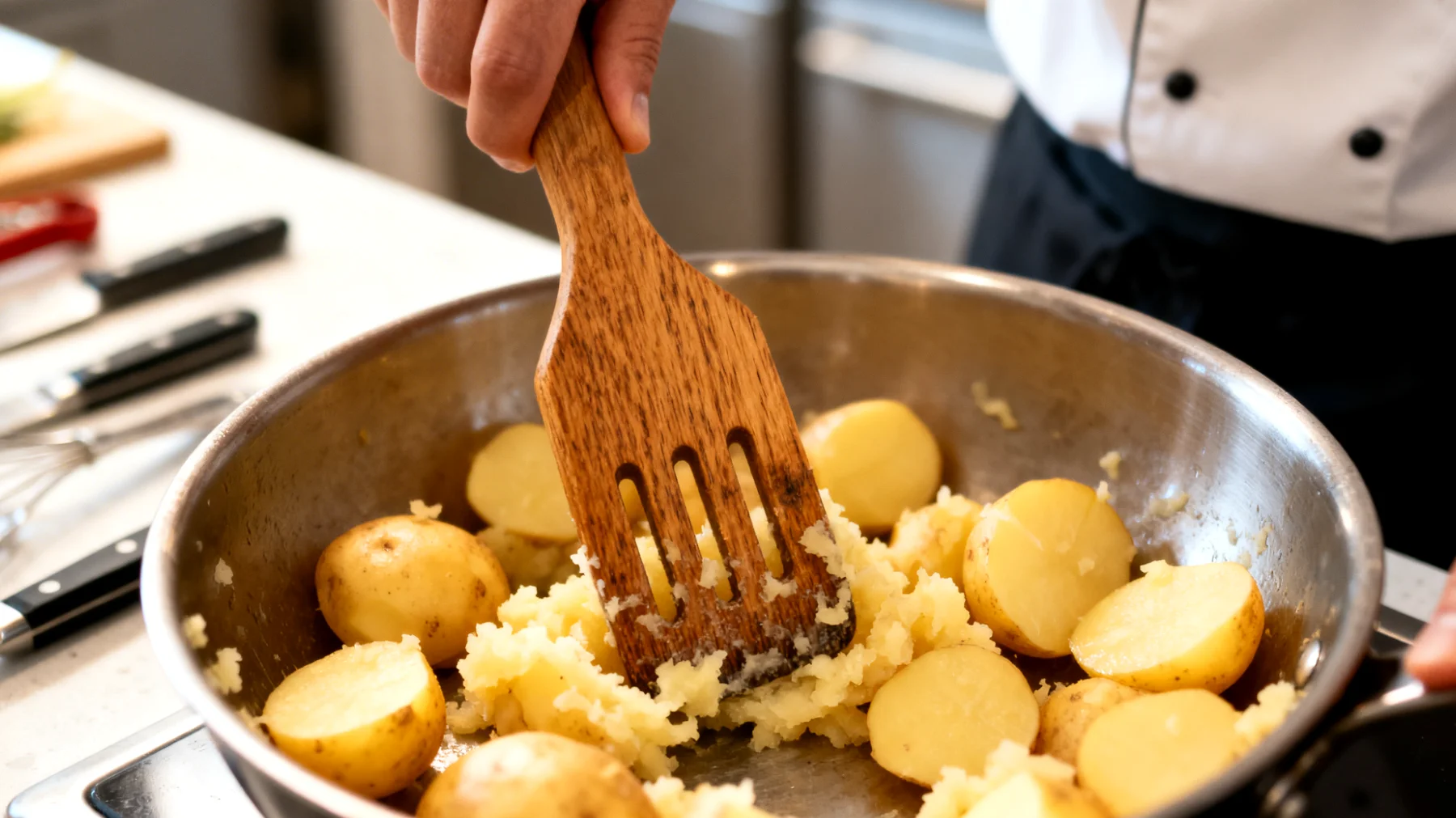 Das gilt insbesondere bei Stampfern mit gelochtem Presskopf. Der Druck verteilt sich über eine größere Fläche, die Zellen der gekochten Knollen brechen auf, ohne dass übermäßiges Rühren nötig wird. Zu viel mechanische Bearbeitung kann Stärke freisetzen und das Püree klebrig machen – ein Effekt, den viele Hobbyköche aus Erfahrung kennen.